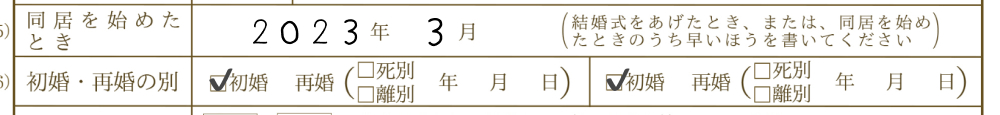 - 結婚式を挙げた年月または同居を始めた年月のどちらか早い方を記入します。