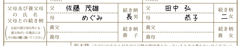 - 父母が離婚している場合は、父母それぞれの現在の氏と名を記入します。